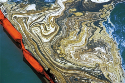围油栏将油污与未污染的海域隔开。图/CFP