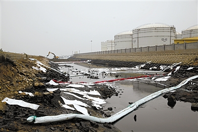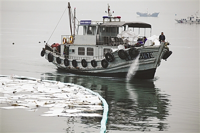 昨日,工作人员在清理青岛胶州湾海面上的原油污染。新华社记者 王申 摄