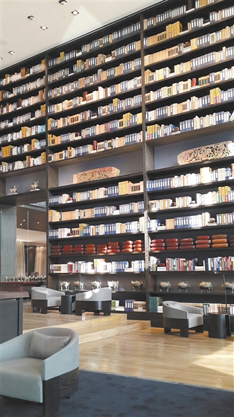 走进酒店,感觉里面的气场很大。大堂、长吧、旋转楼梯、宴会厅、户外庭院等,不仅是一种景观,更体现一种气场。大堂里最显眼的是书架,有几层楼高,上面摆放有很多古籍,客人可以随手拿下来或者请工作人员帮忙拿下来借阅。简洁干净的装饰设计、古典韵味的家具、圆形灯罩缀饰的灯饰充满复古风味,配色以黑色、棕色为主,显得很低调。