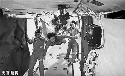 航天员景海鹏、刘旺、刘洋在天宫一号内。央视视频截图