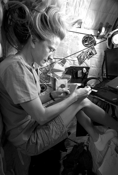 2013年9月22日,美国宇航员凯伦在太空中为自己的儿子缝玩具。
