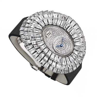 雪花镶嵌的妙处在于,它是一种艺术“再创作”,钻石彼此摩肩接踵地铺满在金属表面。这种镶嵌方法使得镶嵌出的每一个图案和每一块表也不尽相同。积家、卡地亚、爱马仕、芝柏今年以雪花镶嵌技法完成的珠宝表都有着出色表现。伯爵的新款珠宝表更将包括雪花镶嵌在内的多种镶嵌工艺演绎得炉火纯青。
