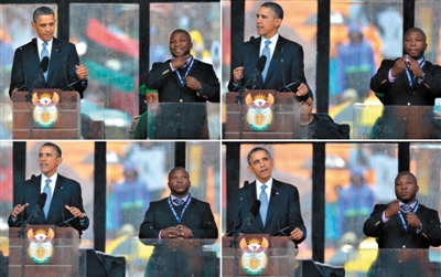 10日,在南非约翰内斯堡的足球城体育场举行的曼德拉官方悼念仪式上,一位充当手语翻译的“手语哥”与自拍的奥巴马一样成为媒体关注焦点。这位被指为“冒牌货”的手语翻译12日现身,自称手语翻译水平一流,但在仪式上精神分裂症发作。南非官员称仪式组织上并无安全漏洞。