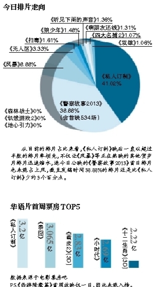 新京报讯 (首席记者孙琳琳)虽然业内对《私人订制》口碑走低,但观众对冯小刚的贺岁喜剧依然买账。该片自上映首日起便连破多项华语2D影片纪录,首周上映四天票房更高达3.2亿元,打破了之前由《泰囧》保持的首周3亿票房的纪录。今日成龙的《警察故事2013》正式公映,但截至记者发稿时,该片首日排片依然没能超过《私人订制》。