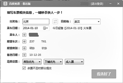 业内人士认为,借助网络软件买到春节回家的火车票已经成为网民的习惯,过去两年的浏览器抢票已经证明了这一工具的便利性。此次百度卫士推出抢票功能的电脑安全软件,凭借其体积小巧、智能维护等产品特点,将为网民提供有效购买火车票的新选择。