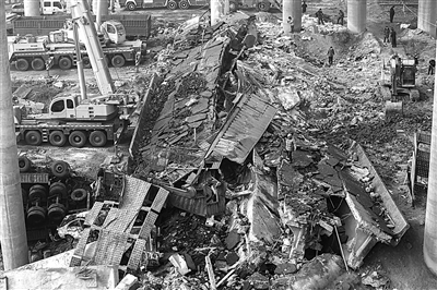2013年2月2日,河南连霍高速义昌段,垮桥现场残骸一片,大型吊机正在进行清理作业。图/CFP