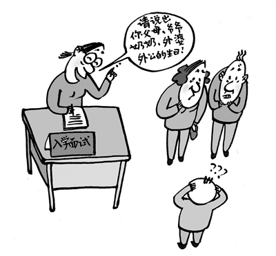“请说出你六位亲人的生日,包括父母、爷爷奶奶、外公外婆。”这不是家庭成员的调查登记,而是一道高中的入学面试题。据媒体报道,近日,武汉市第六中学国际部迎来了200多名前来报考的初三学生,面对这样一道出人意料的考题,近九成学生卡了壳,没能给出全部的答案,一旁陪考的家长也尴尬不已。 漫画/王铎