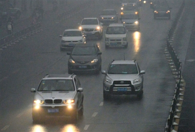 昨日,郑州市区道路上,车辆在雾中行驶。昨日郑州空气重度污染,燃放爆竹加重了雾霾程度。新华社记者 王颂 摄