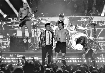 2月2日,美国新泽西,布鲁诺·马尔斯(左二)和红辣椒乐队为2014超级碗献上中场秀。经网友揭发后,贝斯手Flea(左一)承认假弹。