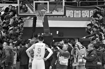 比赛结束后,山东队球员退场时遭到北京球迷“围观”。本版图片/CFP