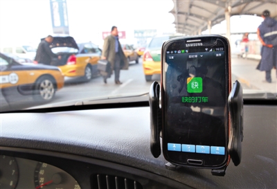 昨日,首都机场第二航站楼出租车下客区,一辆出租车上的手机开着打车软件。新京报记者 尹亚飞 摄