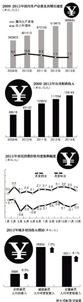 数据显示,2013年城镇居民人均可支配收入实际增长7.0%,农村居民人均纯收入实际增长9.3%,全国居民人均可支配收入实际增长8.1%,全国国内生产总值(GDP)增长7.7%。