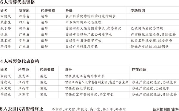4人被罢免代表资格,6人请辞,6人去世;其中7名代表涉嫌违纪违法