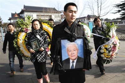 3月7日,八宝山革命公墓,许崇德的孙子抱着爷爷的遗像。当日,宪法学泰斗许崇德遗体告别仪式在八宝山革命公墓举行。