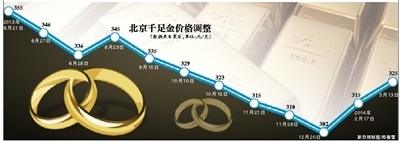 2月中旬至今不到一个月时间,京城主要黄金卖场已经连续两次上调黄金价格,相比去年年末的302元每克,千足金已经累计涨价23元,上调幅度达7.6%。