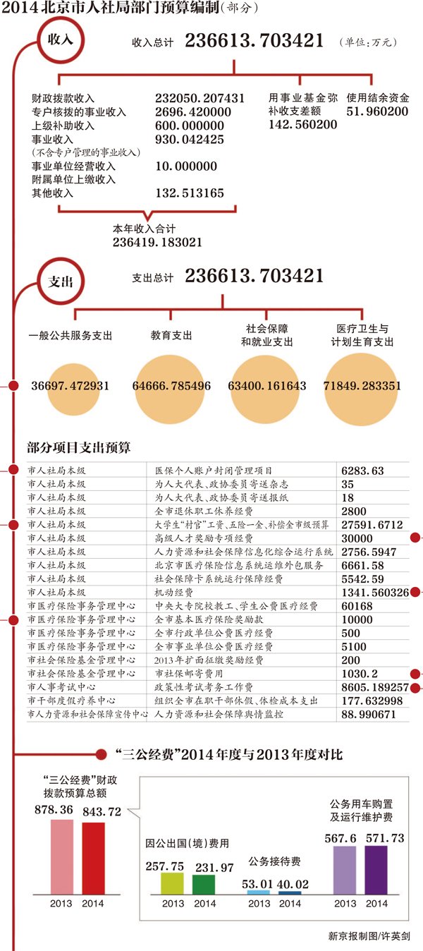 数据显示,2014年,市人力资源和社会保障局支出预算236613.7万元。在支出方面,一般公共服务支出36697.47万元、教育支出64666.79万元、社会保障和就业支出63400.16万元、医疗卫生与计划生育支出71849.28万元。