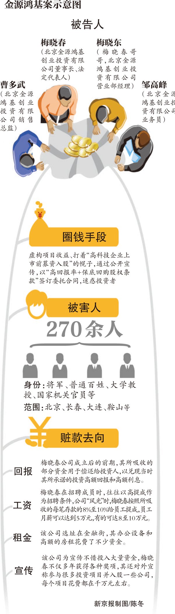 检方起诉书显示,2006年7月至2012年8月期间,梅晓春以金源鸿基的名义,虚构公司拥有多家公司投资项目的收益情况,与被害人签订虚假的《委托代理投资合同》、《公司股权转让合同》,以投资购买公司项目股份或代理投资能获得高额回报或到期保本回购为诱饵,先后在北京、长春、大连、鞍山等地向社会公众非法集资共计人民币2亿余元,并将8600余万元非法占有,给被害人造成巨额财产损失。