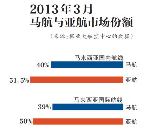 据亚太航空中心的数据,2013年3月,马来西亚国内航线的客运市场上,马航的份额为40%,而亚航占到了51.5%。在国际航班方面,马来西亚的国际航班市场中,亚洲航空的市场份额为50%,马航为39%,处于全面劣势。