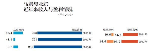 国企体制并未给马航在市场竞争中带来优势。2011财年至2013财年,马航的净亏额分别为47.4亿元、8.1亿元、22亿元。