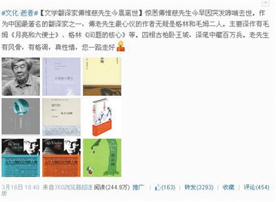 惊悉我国著名翻译家傅惟慈先生于3月16日上午离世,新闻一出,读者在互联网平台上以各种形式追思傅老的声音即刻绵延不绝。这条“文学翻译家傅惟慈先生今晨离世”的书评官方微博,阅读量近250万次,转发3300余次,足见读者痛悼之心。