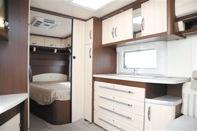这款房车吸引人的在于两个地方,首先厕所、浴室是干湿分开的,虽然这个卫生间看起来并不显得很大,但是放在房车上确实算是“超大型”的了,而且可以提供沐浴和如厕,避免了早上起床时的“使用高峰”。独立的双人床是这款车的另一个迷人之处,之前的双床设计都是独立单人床,感觉像是标间,而双人床的设计让“房间里”立刻增加了温馨感。