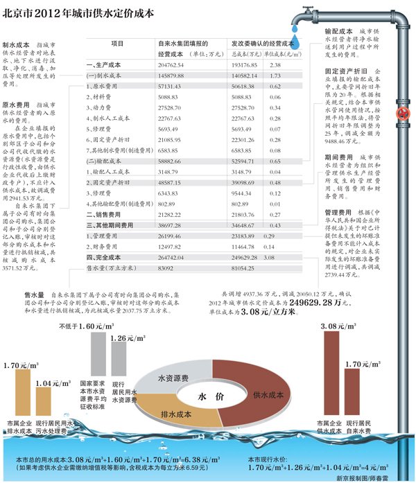 报告显示,2012年市属企业供水成本为每立方米3.08元,目前北京现行居民自来水费每立方米为1.70元,即不算政府补贴,每出售一立方米水亏1.38元。