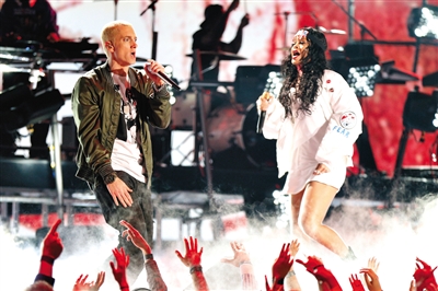 昨日痞子阿姆(Eminem)联手蕾哈娜做客2014年MTV电影盛典,现场二人共同合唱了《The Monster》。该作品是继《Love The Way You Lie》后,二人于去年年底共同发行的,曾登顶Billboard的冠军单曲。这一场“迟来”的《The Monster》全球首秀无疑为2014MTV颁奖礼制造了高潮。据悉,这一“双响炮”组合将于8月在美国纽约、洛杉矶以及底特律等城市拉开巡演。