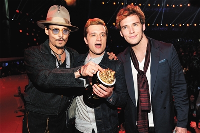 约翰尼·德普为《饥饿游戏2》两位男主演乔什·哈切森、山姆·克拉弗林颁发了年度电影奖。