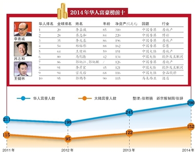 榜单显示,今年共有290位华人上榜,华人在福布斯全球富豪榜上人数的占比达到了17.6%的新高。榜单前四强皆被香港富豪占据。有着“赌王”之称的银河娱乐董事长吕志和以220亿美元排在李嘉诚之后,位列第二位。在过去一年,吕氏家族的财富连续第二年翻番,银河娱乐集团的市值甚至超过了常年稳居榜首的香港首富李嘉诚旗下的主要企业长江实业集团。恒基兆业董事局主席李兆基和香港新世界董事局主席郑裕彤分列三四位。