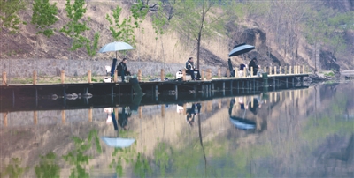 宝山镇渣汰河沿岸风光旖旎,一个拦水湖泊形成的天然钓场,以四周翠色的山峦为屏障,几位游客静静地坐在岸边的钓台上。