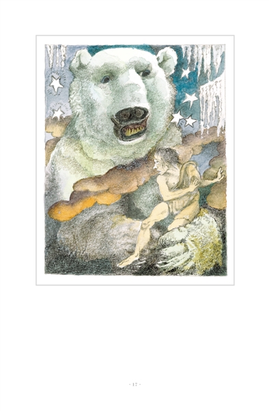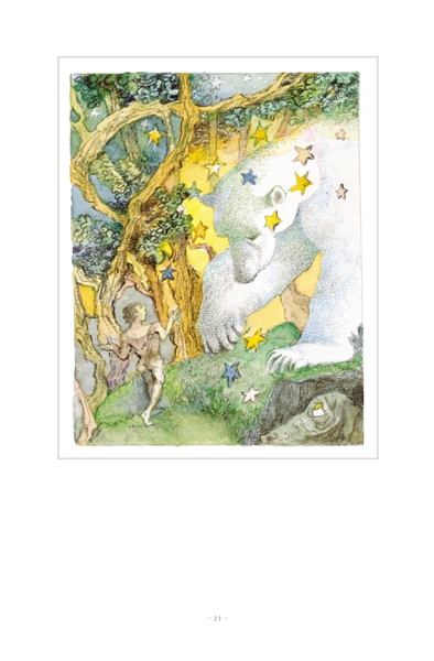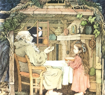 故事开始时,寡居的母亲与小女儿过着安宁幸福的生活,她们破败小屋前的小树,长着金色温暖的叶子,一个小天使坐在右边的树上小憩。屋背后是繁密茂盛的大树。而当灾难逼近,母亲神色惶然,迅速变得苍老,唯有眼睛因期盼仍存有宁和。故事结尾时,垂暮的母亲展开双臂,准备拥抱失而复得的女儿,嘴角隐然微笑,眼目已经枯竭。整个绘本中,孩子进入森林前,母亲那充满惶恐、期盼和爱的凝视,是唯一的凝视。