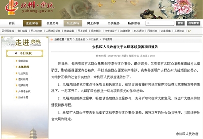 昨日,杭州市余杭区政府网站发布《余杭区人民政府关于九峰环境能源项目通告》,对近日发生的市民聚集事件正面回应。
