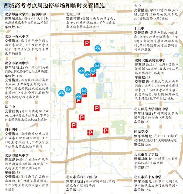 同时,根据考点周边情况,在19个考点周边均开辟临时停靠点,方便考生上下车。在有条件的考点周边,还将开辟临时停车场,方便学生家长等候。临时停车位的相关信息,今起可访问西城政务微博“北京西城”查询。