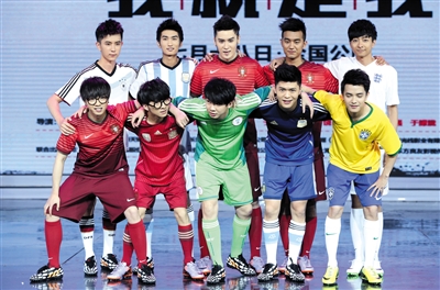 华晨宇(下排左一)率快男兄弟身着世界杯参赛国球衣登台。新京报记者 郭延冰 摄