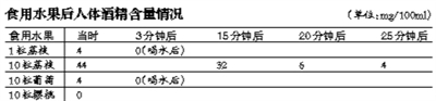 实验结果:短时间内大量吃荔枝会测出体内有酒精含量,且瞬间数值较高。而食用葡萄、樱桃后,人体酒精含量增长情况则不甚明显。