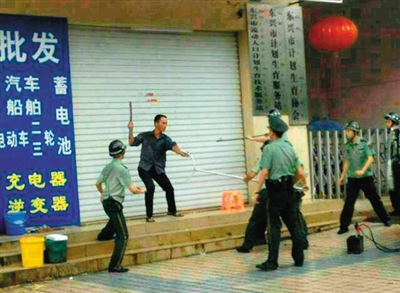 去年7月23日,何深国砍人后与警方对峙。网络供图