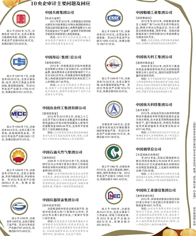 2013年,审计署统一组织了对11家央企财务收支审计,审计资产量占企业资产总额的50%以上。这11家央企包括:中国烟草总公司、中国核工业建设集团公司、中国航天科技集团公司、中国航天科工集团公司、中国船舶工业集团公司、中国兵器装备集团公司、中国石油天然气集团公司、中国大唐集团公司、中国海运(集团)总公司、华润(集团)有限公司和中国冶金科工集团有限公司。