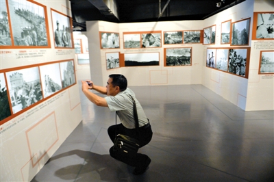 昨日,抗战纪念馆,一位观众观看展览照片,并用手机翻拍下来。新京报记者 吴江 摄