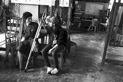 姚晨和等待安装假肢的难民聊天。