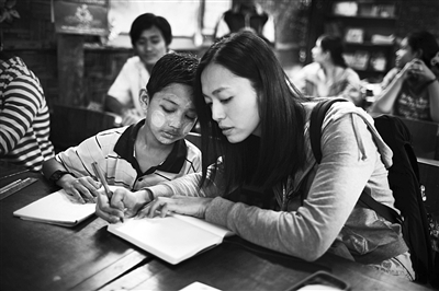 泰语课上一个缅甸男孩和姚晨交换知识。