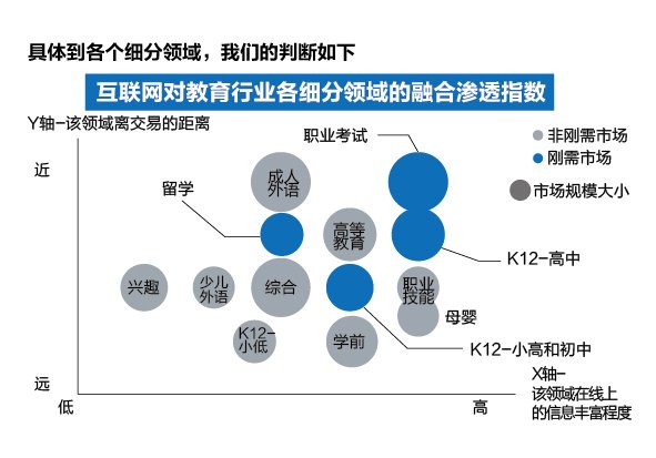 通过分析腾讯科技发布的《2014年互联网跨界趋势报告》,相对游戏、旅游、旅游,很多教育还是在线下实现,所以教育目前来讲渗透率还是处于不高的阶段。细分到教育行业的各个领域来看,好未来认为职业考试、留学、K12阶段的互联网渗透指数相对较高。