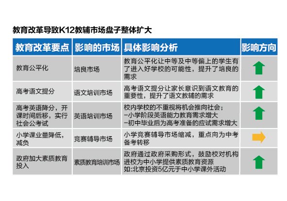 特别是一系列教育改革导致K12教辅市场的盘子整体扩大。在生源方面,随着教育公平化,以前的择优的方式正在改变,随着有关部门推进义务教育免试就近入学制度,一些好的高中有可能需要到其周边相对较差的高中选取生源,而一般中学学生到好的高中的机会也增多,这让培良市场的需求增大。其他政策方面也有很多触及细分教辅市场,例如高考语文提分让家长意识到语文教育的重要性,提升了语文教辅的需求。小学竞赛辅导市场缩减,重点向为中考备考转移。政府通过政府采购形式,鼓励校外机构进校为中小学提供素质教育资源等等。