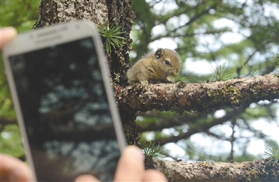 松鼠将花生米叼上树,在游人的镜头前享用。