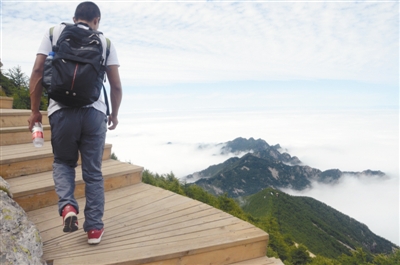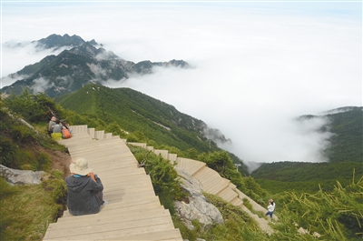 乘索道再攀400米,上板寺的景观更为壮观,远山被白云压身。再上行,木板铺设的步道在太白红杉(又名“太白落叶松”)林间穿梭而上,光影斑驳,气温也刚刚好。