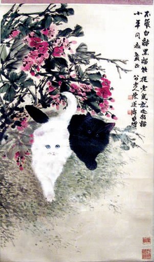 邓小平家中也挂有一幅《双猫图》。一只猫毛色雪白、茸毛轻柔,另一只猫毛色乌黑、黑里透亮。画的上方,是几行遒劲苍老的题词:“不管白猫黑猫,会捉老鼠就是好猫。”画者是被誉为“江南猫王”的著名画家陈莲涛。