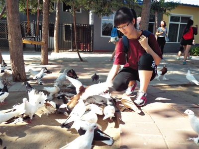 夏令营中有很多亲近自然的户外活动,比如给鸽子喂食。资料图片
