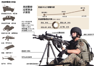 长年的缉毒行动及“9·11”后的反恐需求,让美国执法部门内出现一种全新的形象——“武装战警”。这些战警武装到牙齿,随时准备应付各种凶恶的犯罪嫌疑人,但也给普通民众的自由和安全构成一定威胁。此次抗议活动的报道中,美国媒体在描述现场时用到一个词——SWAT。