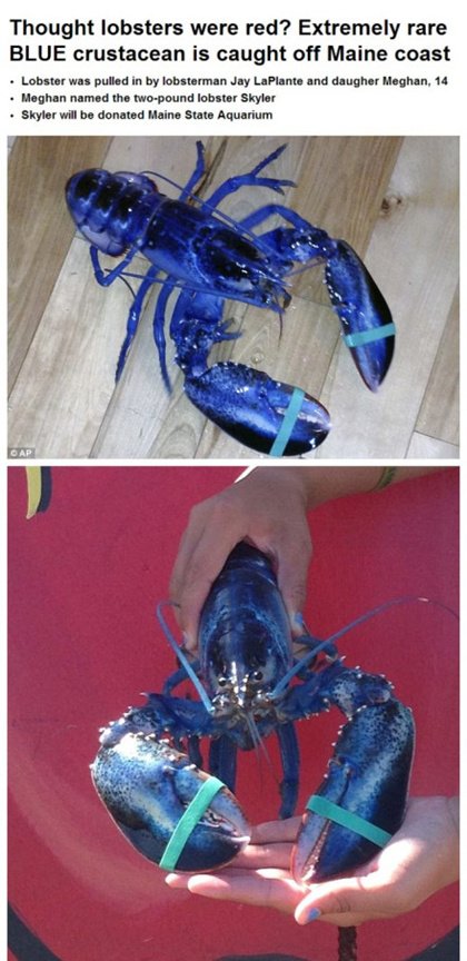 【事件】一对父女上周六捕获一只通体蓝色的龙虾,据称是约200万只龙虾里才会出现一只的罕见蓝龙虾。这种龙虾因为基因缺陷,身体会过多产生一种蛋白质,使外壳呈现亮蓝色。专家说蓝龙虾可以安全食用,不过父女俩舍不得,给龙虾取名为Skyler,并捐献给水族馆。