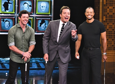 8月18日,麦克罗伊(左)和伍兹(右)携手亮相美国一档电视节目。图/CFP