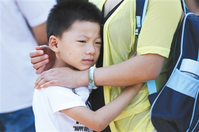 2013年8月29日,石景山区六一小学校门口,一位准一年级男生趴在妈妈怀里。 新京报记者 尹亚飞 摄
